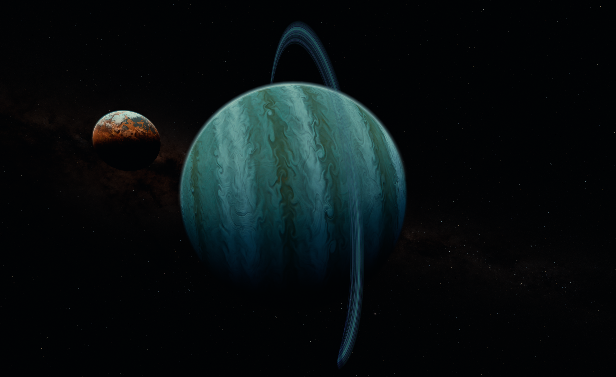 The planet rings are a separate mesh and material, also an unlit emissive. It uses hacky math to fake a shadow from the planet. It also supports backscatter from the sun as you can see in the shot below.