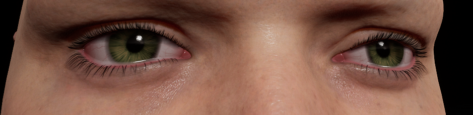 There are two subtle but extremely important effects that must be present in human eyes in order to keep them from looking dead or unnatural: The tiny shadow on the eyeball from the upper eye lid and the wet line underneath at the line of contact with the lower eye lid. Without both of these effects, the eyes will always look plastic, regardless of how realistic the shading or iris refraction is.