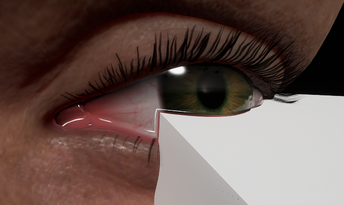 To avoid all this additional work, I came up with a way to do both effects dynamically in the eyeball material itself. It is driven directly by the eye’s contact line with any intersecting geometry and therefore supports any eye shape at any time without additional mesh sections.