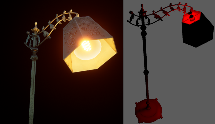 To avoid the need for additional point lights, all the lighting fixtures have an additional material effect driven by the attached light color and brightness to fake self-illumination. The masks are pre-baked, per fixture mesh, to vertex colors in maya. The effect simply multiplies itself by the base color of the asset to give the illusion of being lit.
