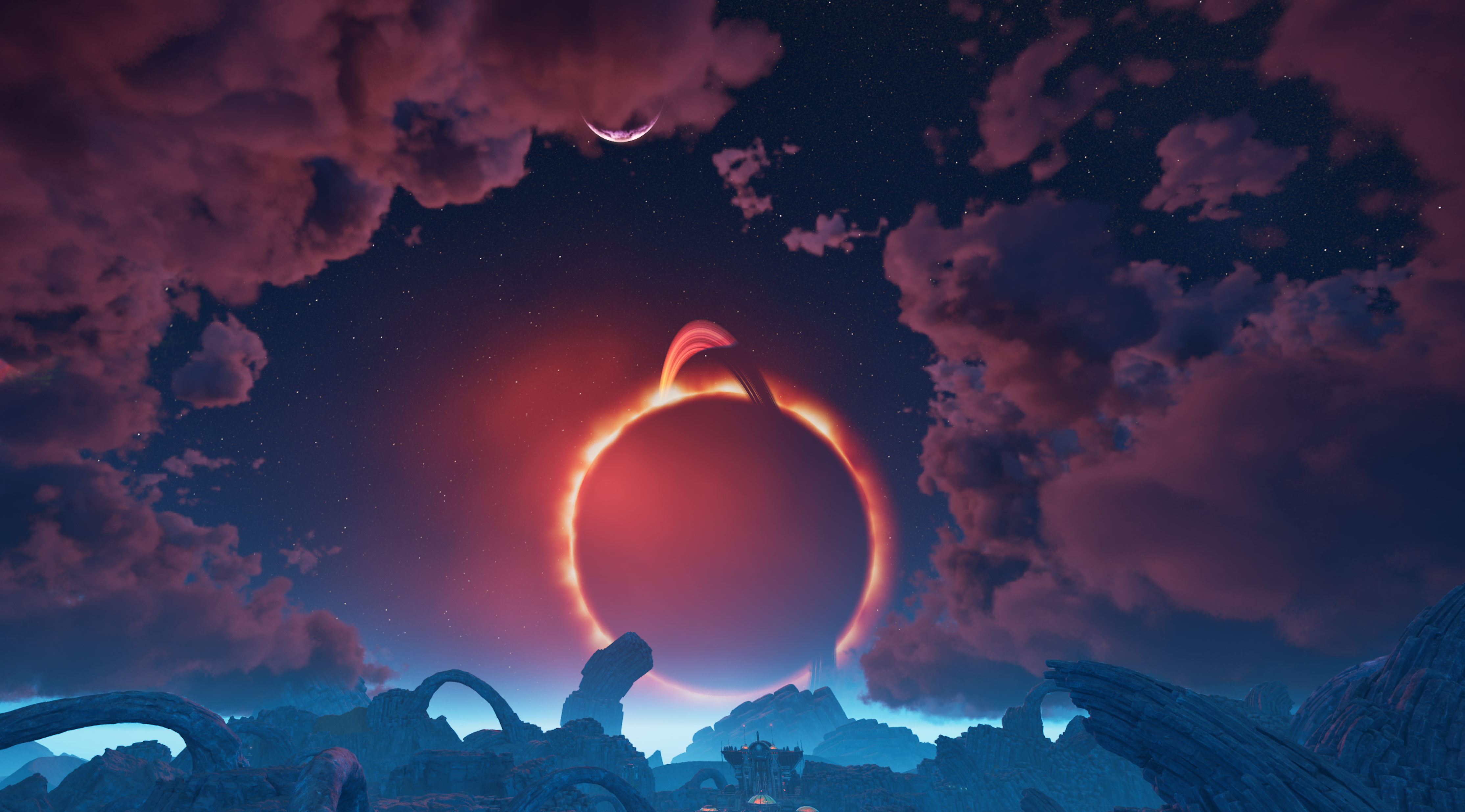 There is an additional additive ring mesh that always faces the camera. When the sun is behind it, the ring’s material logic expands its vertices along their tangents in world space to give a dramatic glow in front of the planet during an eclipse. The ring provides additional atmosphere blending when not used in an eclipse.