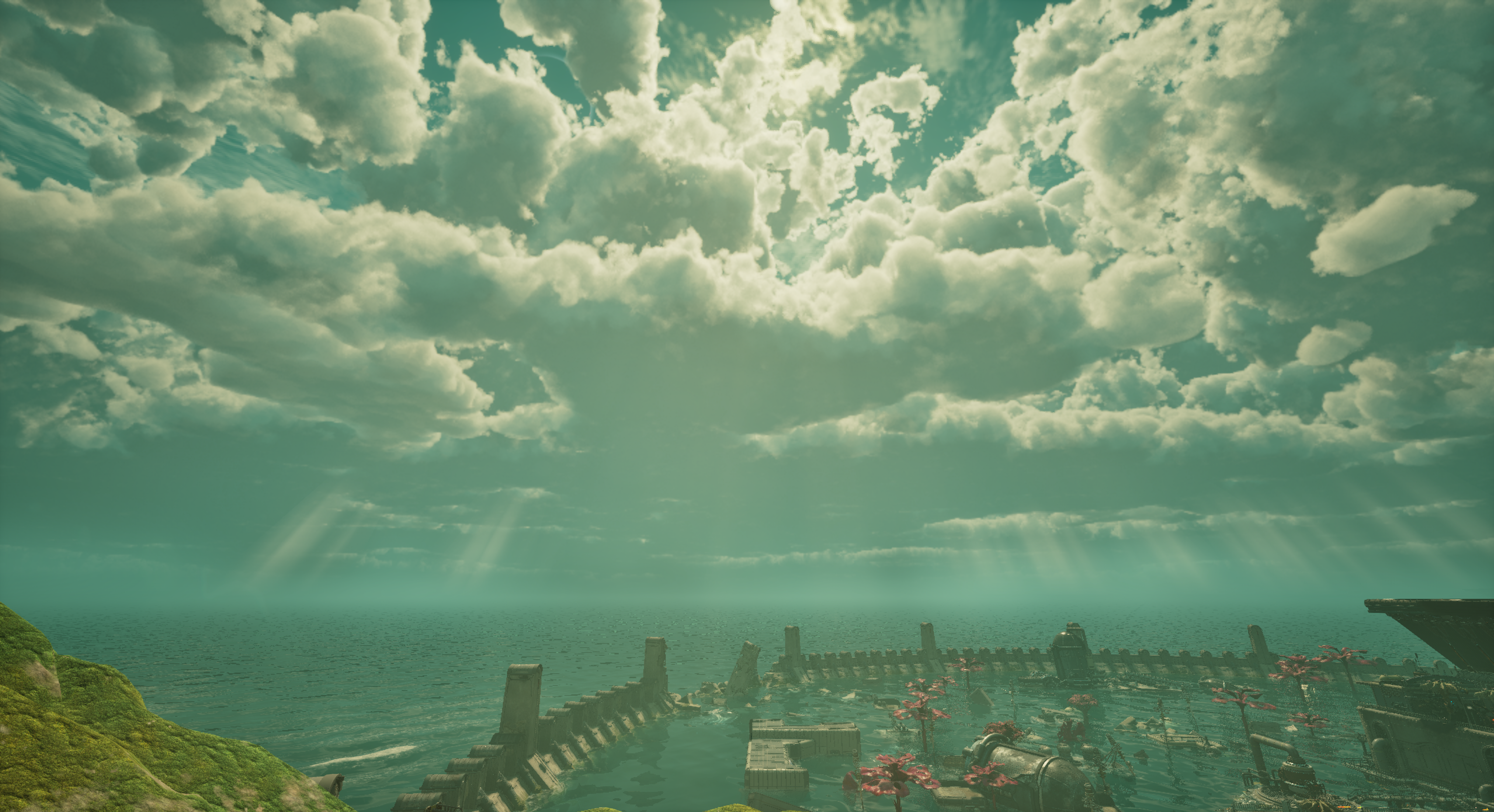 So to complete the effect into the vista, I made the far-distant sun rays out of a big mesh that follows the player. It was several concentric cylinders with another custom material. The material reads the same low-resolution cloud-density render target used in the fog to determine whether any vertex, given its world position on the ground, the sun angle, and the cloud density, would or would not be in sunlight. If it would be in sunlight, it stretches up along the sun sun vector and brightens. If not, it collapses so you don’t pay the pixel cost for a ray that isn’t there.