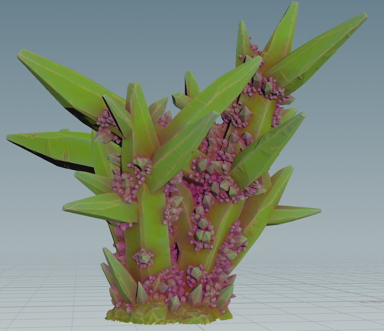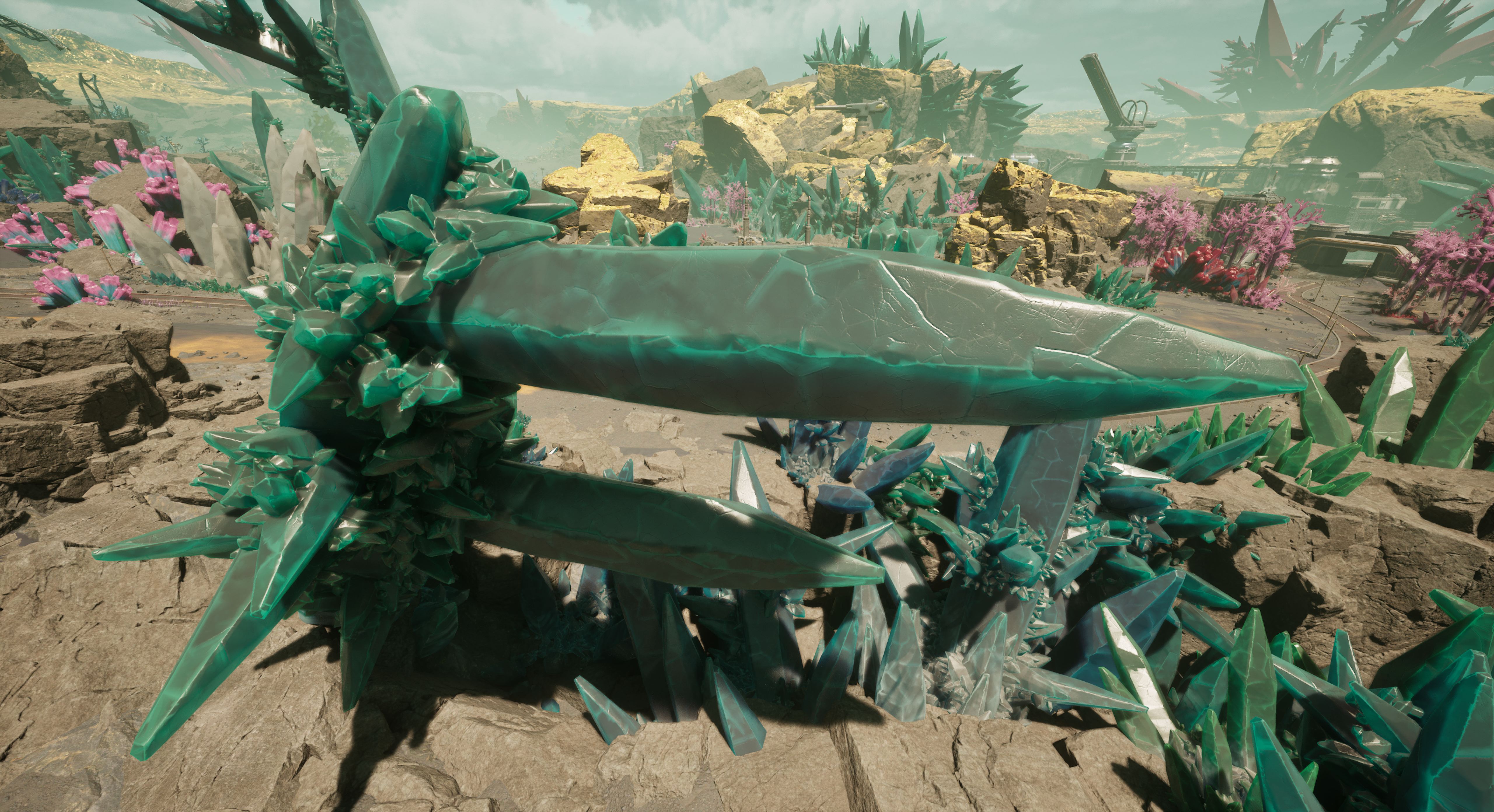 The crystal material muti-sampled a greyscale cracks texture with a UV offset informed by camera angle to fake the depth of the cracks going further into the surface, even though the material is opaque.
