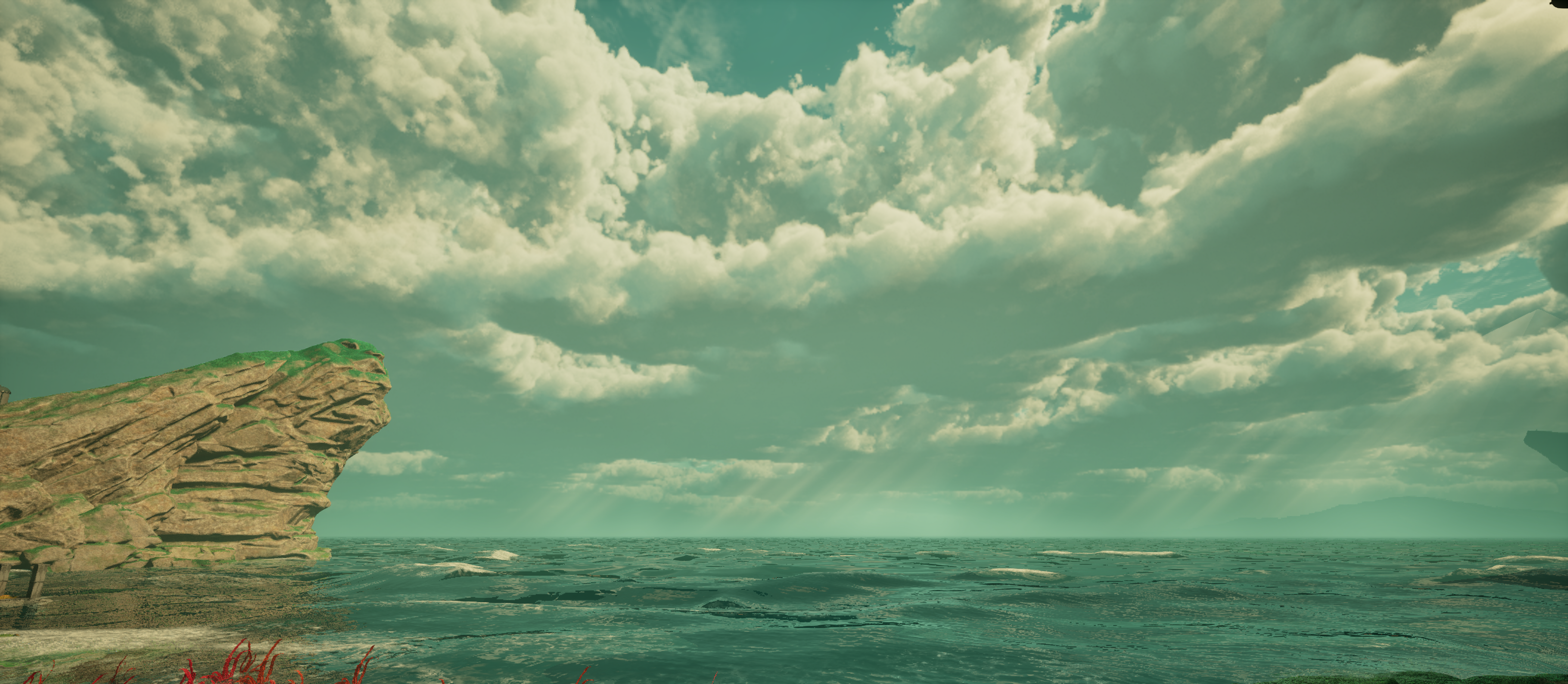 The near-foreground sun rays are of course just Unreal’s volume lighting. The mid-distance sun rays were a separate feature added by Michael Edwards to the cloud pass to unify the scene a bit more and they look great. But both methods are limited by sample distance and would be much too expensive to just expand way out to the horizon.