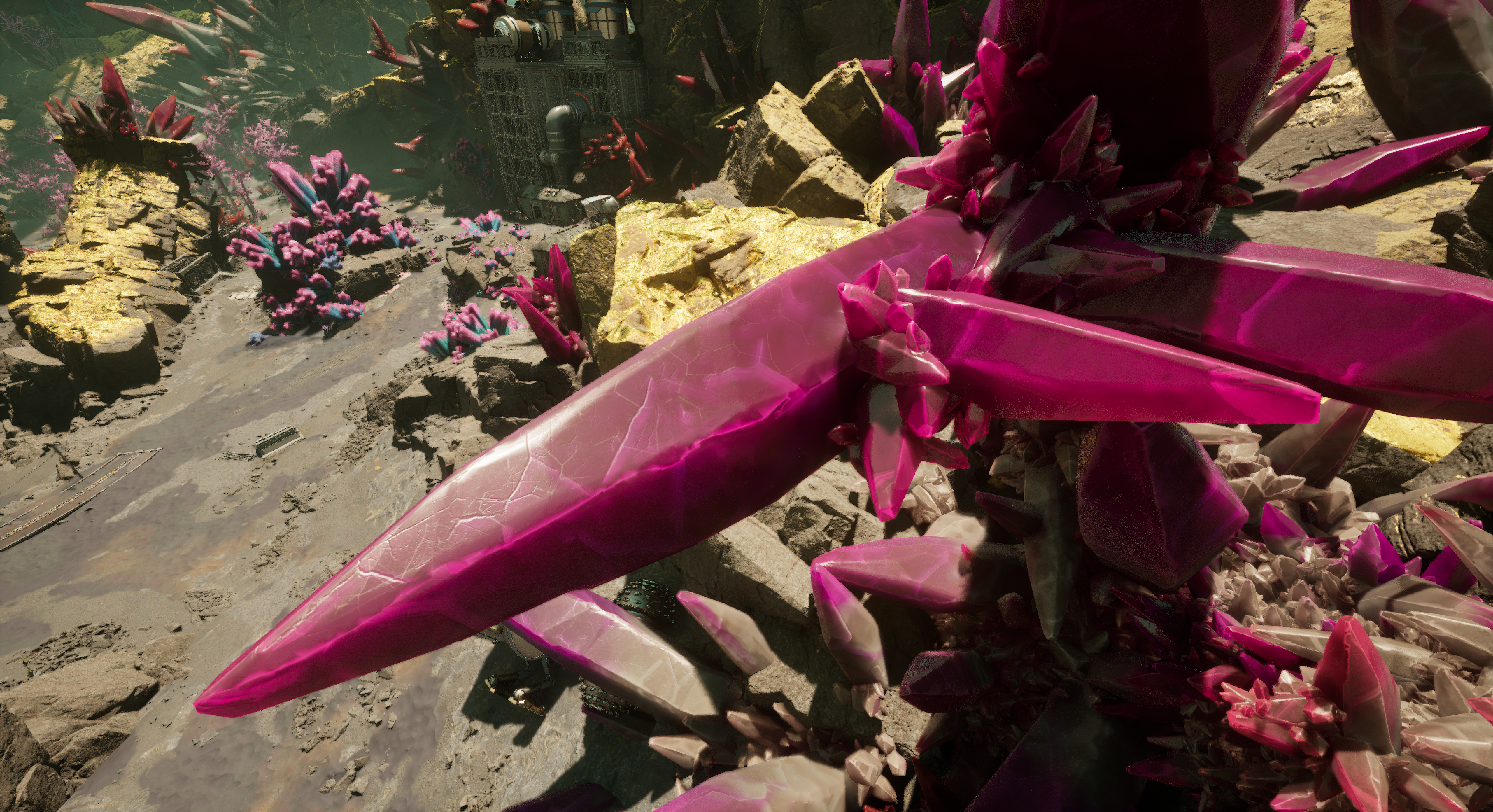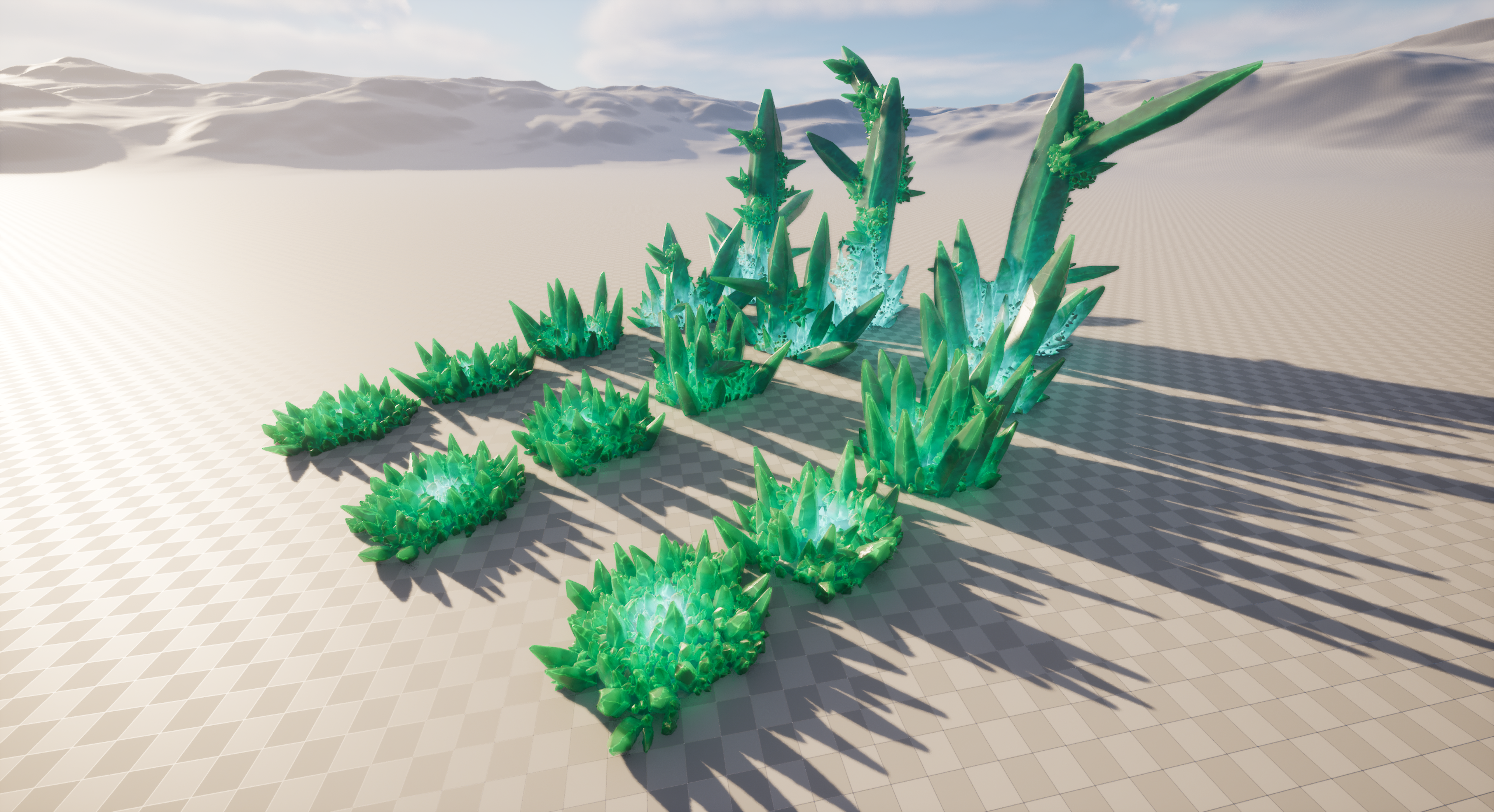 I made the pointy crystal meshes in houdini, and also made their fake-depth material effect in unreal.