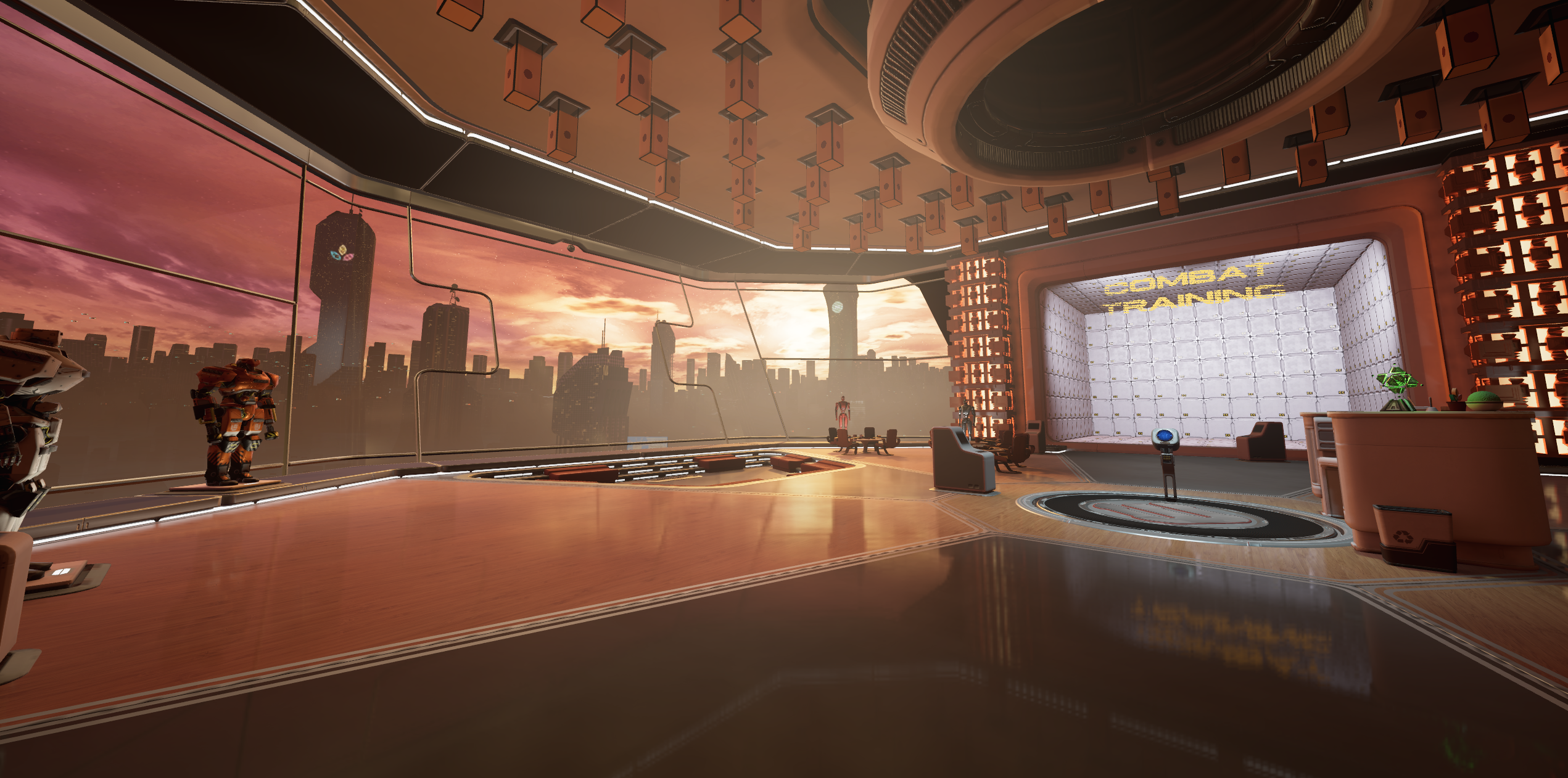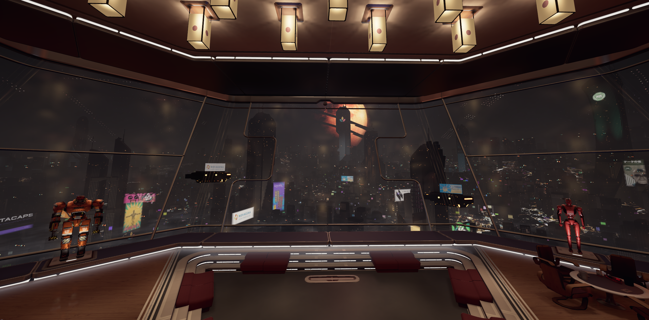 The vista outside the window is one of the few pieces of environment art I made myself. I made a bunch of building models and scattered them in-engine using the foliage tool, to minimize the draw-call load of the scene. Then I made several larger ‘hero’ buildings that would get their own individual placement. A fog plane, an emissive ground plane, height fog, and glowing billboards helped give the city more atmosphere, while distant particle systems spawning endless car sprites provided the traffic movement that makes it feel more alive. The window is an unlit material with a cube-map capture of the room on it to fake the reflection.