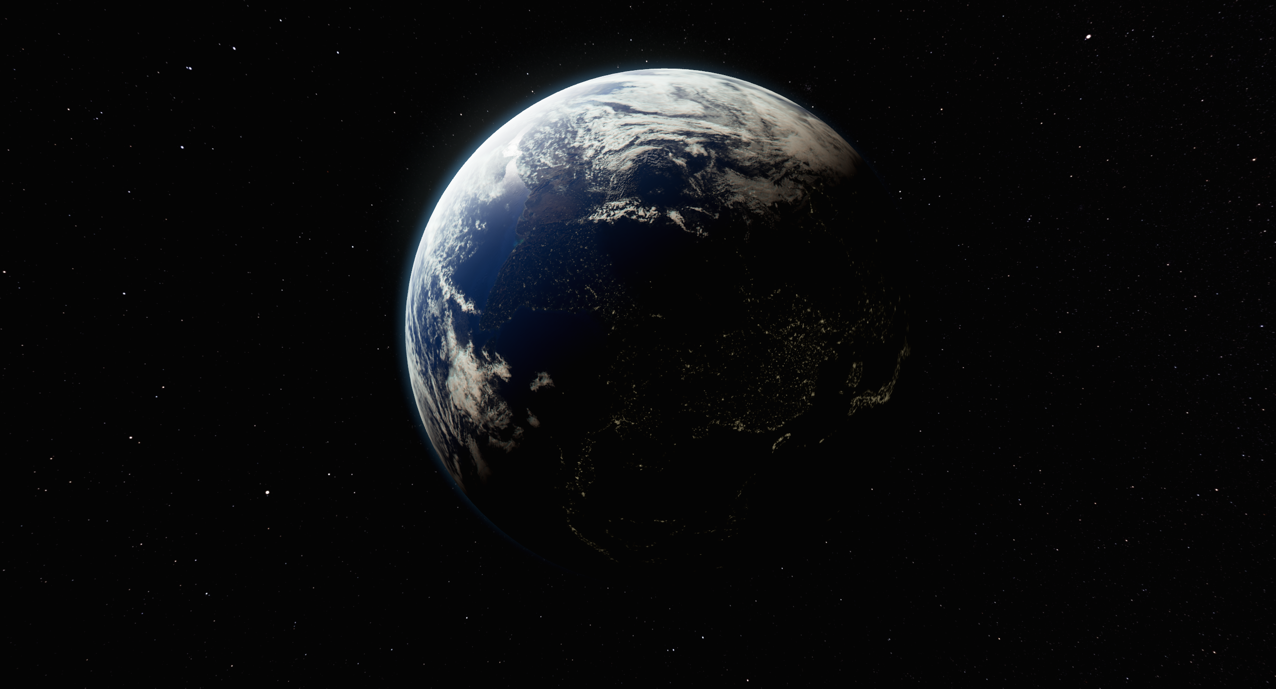 When the player starts the game, the title screen is a stage-like platform out in space with a view of the entire world. I made all the materials myself, with textures courtesy of NASA’s online archive. The globe turns slowly and the player can see the cities light up on the night side. I used cheap material logic to fake SSS on the oceans and clouds.